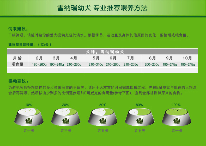 干糧飼喂,請隨時給您的愛犬提供充足的清水。根據季節、運動量及身體其他原因的變化,酌情增減喂食量。